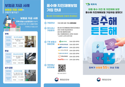 목포시는 태풍, 홍수, 지진 등 각종 자연재해로 인한 피해에 대비하고, 피해 발생 시 실질적인 보상을 통해 시민의 조기 생활 안정을 돕기 위한 ‘풍수해·지진재해보험’사업을 운영하고 있다고 14일 밝혔다. ‘풍수해·지진재해보험’은 태풍, 호우, 홍수, 강풍 등 풍수해와 지진으로 인한 피해를 폭넓 보장하는 정책성 보험이다. 가입 대상은 ▲주택(동산