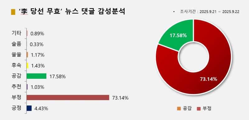포털 다음의 댓글 정책 변경(타임톡 시행)에 따라 다음에 올라온 기사 댓글은 수집하지 않았다. 다음에서 반응수가 가장 많은 기사는 연합뉴스 9월 21일자 <장동혁, 대구 집회서 "이재명 끝내야…정청래는 테러집단 수괴">로 4597개로 집계됐다(화나요 4354 개).