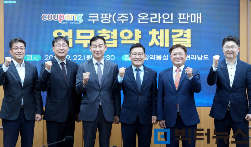 전남도는 22일 도청 정약용실에서 쿠팡㈜, 전남도상인연합회와 함께 ‘전통시장 온라인 판로 확대를 위한 업무협약’을 했다.