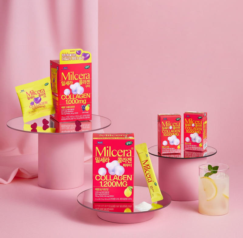 밀세라 콜라겐 제품은 총 3종으로 구성된다. '밀세라 콜라겐 드링크'는 125mL 음료 제품으로 저분자 콜라겐 10,000mg과 밀크세라마이드 600mg을 함유했다. 프랑스산 프리미엄 비오틴과 비타민C, 글루타치온을 추가해 종합적인 이너뷰티 케어가 가능하며, 레몬소다 맛에 설탕무첨가 45kcal로 가볍게 마실 수 있다.