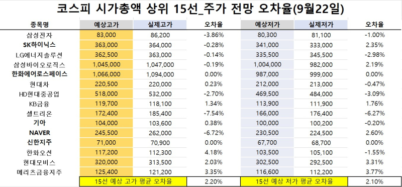 지난주 빅터뉴스 시가총액 상위 15선 예상주가 평균 고가와 저가 오차율은 각각 2.20%와 2.10%를 기록했다.