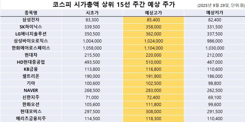 [편집자주] 주식시장을 장기간 관찰하여 보면 일정한 폭을 기준으로 등락을 거듭하면서 추세 상향 내지는 추세 하향의 방향으로 진행하고 있음을 알 수 있다. 빅터뉴스는 주식시장의 이런 특성을 고려해 주식투자자에게 도움이 되고자 각 종목의 예상고가와 예상저가를 주간단위로 제공하고자 한다. 종목 선정은 우선 시범적으로 국내 유가증권시장(코스피) 시가총액 상위 15개 종목을 추려 주간 예상고가와 예상저가를 제공한다. 제공하는 주가 예측치는 아주 정밀한 예측치는 될 수가 없으며 일정 부분 예측 오차를 내포하고 있으므로 투자자들은 이 점을 감안해야 한다.