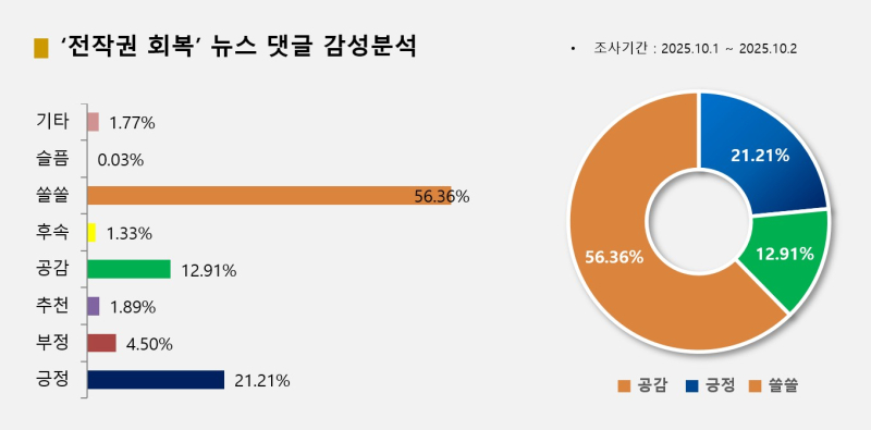 빅터뉴스가 10월 1일부터 2일 오전 10시까지 '전작권'과 '회복', '대통령실' 키워드로 관련기사를 집계한 결과 포털 네이버와 다음을 기준으로 관련 기사는 모두 130개, 댓글 4288개, 반응 3446개로 집계됐다. 온라인 감성별로 네이버의 '쏠쏠정보(1942개, 34.50%)', 다음의 '좋아요(731개, 39.62%), 네이버의 '공감백배(445개, 15.47%)' 등의 순이었다.