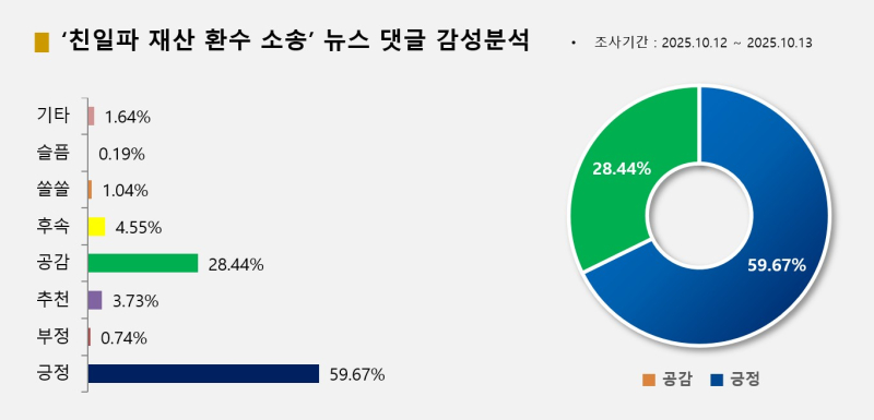빅터뉴스가 10월 12일부터 13일 오전 11시까지 '이해승'과 '법무부', '환수' 키워드로 관련기사를 집계한 결과 포털 네이버와 다음을 기준으로 관련 기사는 모두 62개, 댓글 851개, 반응 3650개로 집계됐다. 온라인 감성별로 다음의 '좋아요(2178개, 59.67%)', 네이버의 '공감백배(1038개, 28.44%)' 등의 순이었다.