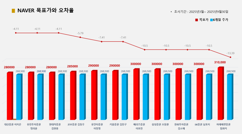 11개 증권사가 추천한 NAVER의 경우 대신증권 이지은·유진투자증권 정의훈·현대차증권 김현용 애널리스트가 목표가(28만원) 대비 종가(26만8500원) 오차율 –4.11%로 적중시켜 공동 1위에 올랐고, 교보증권 김동우 애널리스트가 오차율 –5.79%로 그 뒤를 따랐다.