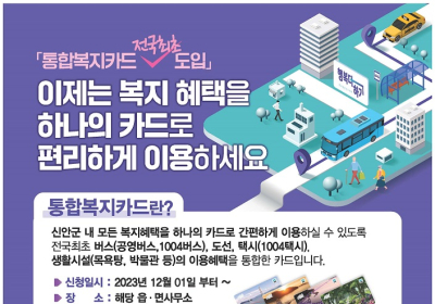각종 복지혜택을 카드 한장으로 해결할 수 있는 서비스가 전남 신안군에서 처음 시작한다.신안군(군수 박우량)은 1일 "분야별로 분산된 복지 혜택을 하나로 통합하고 이용자의 편의를 개선한 통합복지플랫폼 '행복 더하기 통합복지카드' 서비스를 전국에서 처음으로 오픈한다"고 밝혔다.'행복더하기 통합복지카드'는 65세 이상 어르신, 장애인, 유공자, 기초생활수급자 등의 다양