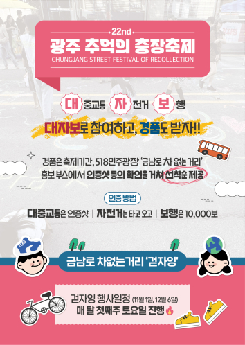 이를 위해 광주시와 손잡고 5·18 민주광장에서 홍보 부스를 운영한다. 이곳에서는 금남로 차 없는 거리 사업의 필요성과 그동안 추진 성과를 효과적으로 홍보하기 위해 ▲포토존 이벤트(포토존에서 찍은 사진을 SNS에 올리면 경품을 선착순으로 제공) ▲대자보 실천 이벤트(대중교통, 자전거, 보행을 이용해 참여한 방문객에게 선착순으로 경품 증정) 등을 진행한다.