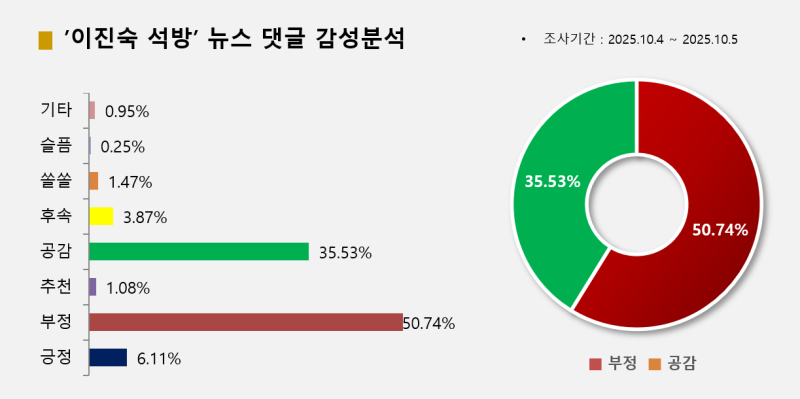 빅터뉴스가 10월 4일부터 5일 오전 7시까지 '이진숙'과 '석방', '인신', '구금', '신중히' 키워드로 관련기사를 집계한 결과 포털 네이버와 다음을 기준으로 관련 기사는 모두 136개, 댓글 1만9283개, 반응 3만7354개로 집계됐다. 온라인 감성별로 다음의 '화나요(1만8955개, 50.74%)', 네이버의 '공감백배(1만3273개, 35.53%)' 등의 순이었다.