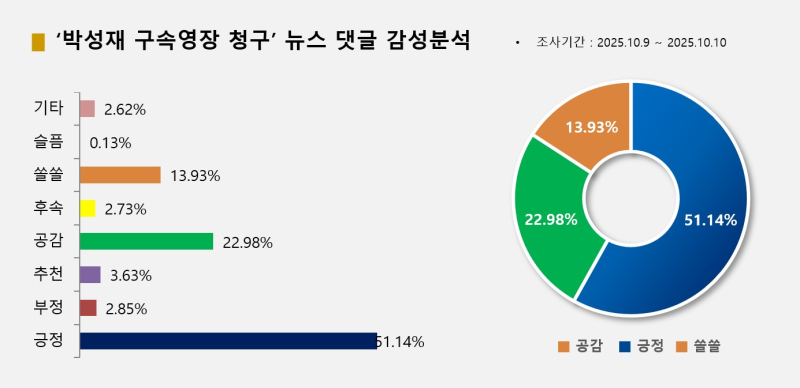 빅터뉴스가 10월 9일부터 10일 오전 10시까지 '박성재'와 '구속영장', '청구' 키워드로 관련기사를 집계한 결과 포털 네이버와 다음을 기준으로 관련 기사는 모두 230개, 댓글 5545개, 반응 1만2696개로 집계됐다. 온라인 감성별로 다음의 '좋아요(6493개, 51.14%)', 네이버의 '공감백배(2917개, 22.98%)', '쏠쏠정보(1768개, 13.93%)' 등의 순이었다.