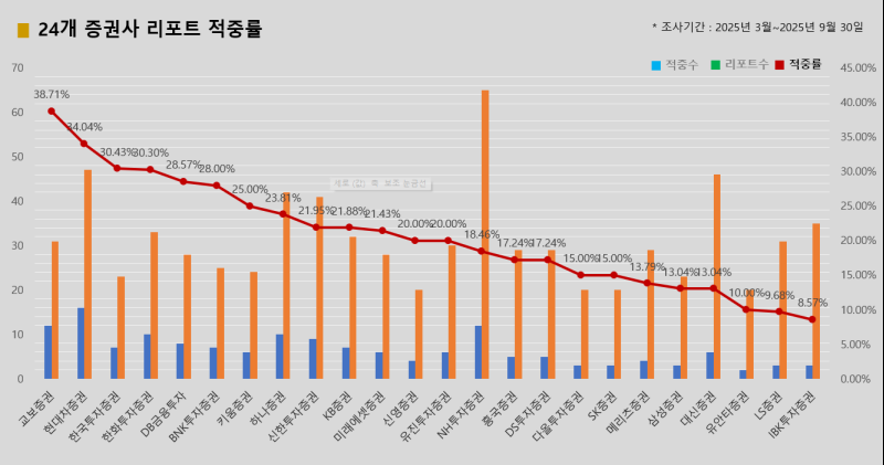 적중률 부문 1위는 교보증권(38.71%)이 1위에 올랐고, 현대차증권(34.04%), 한국투자증권(30.43%), 한화투자증권(30.3%), DB금융투자(28.57%) 등이 그 뒤를 이었다.