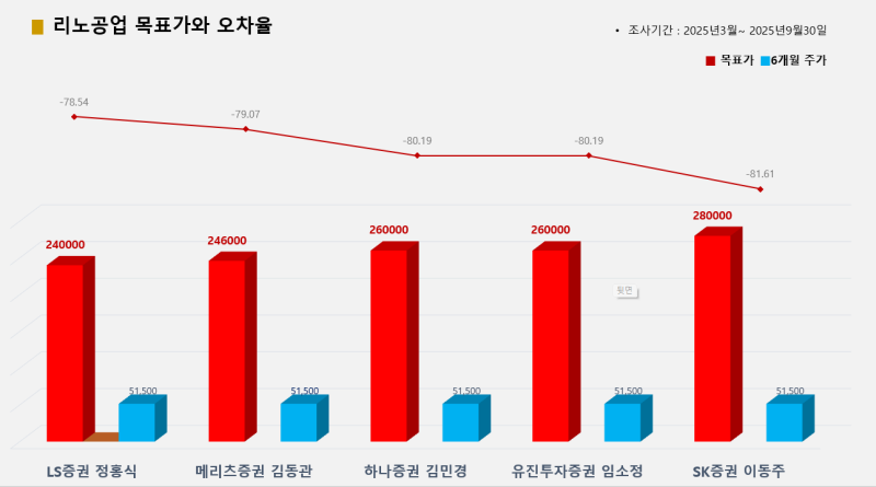 5개 증권사가 추천한 리노공업의 경우 SK증권 이동주 애널리스트가 목표가(28만원) 대비 종가(14만3100원) 오차율 –81.61%로 꼴찌였고, 유진투자증권 임소정 애널리스트가 오차율 –80.19%로 그 뒤를 이었다.