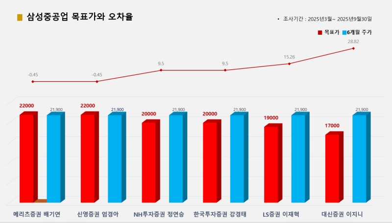 6개 증권사가 추천한 삼성중공업의 경우 메리츠증권 배기연·신영증권 엄경아 애널리스트가 목표가(2만2000원) 대비 종가(2만1900원) 오차율 –0.45%로 적중시켜 공동 1위에 올랐고, NH투자증권 정연승·한국투자증권 강경태 애널리스트가 오차율 9.5%로 그 뒤를 따랐다.