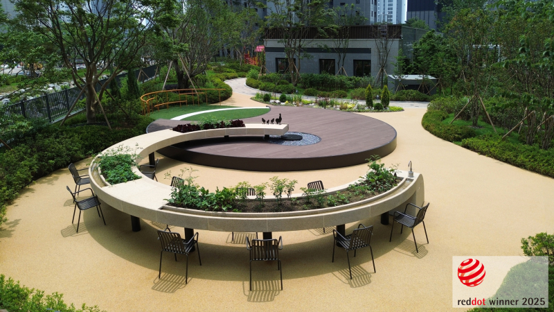 세계 3대 디자인상 중 하나인 레드닷 디자인 어워드에서 수상한 ‘팜핏(Farm Fit)’은 ‘Farm(텃밭)’과 ‘Fitness(피트니스)’를 결합한 생활형 복합 조경공간이다. 입주민이 농업 활동과 여가, 운동, 사회적 교류를 동시에 즐길 수 있는 외부 커뮤니티 공간으로 설계됐다. 특히, 기존 격자형 텃밭 구조를 탈피해 원형의 모듈형 시설물을 도입함으로써 공간의 포용성과 안전성을 높였다. 연령, 성별, 장애 유무와 관계없이 누구나 이용할 수 있는 유니버설 디자인 원칙을 구현했으며, 단순한 조경을 넘어 세대 간 교류와 커뮤니티 형성을 촉진하는 혁신적 모델로 평가받았다.