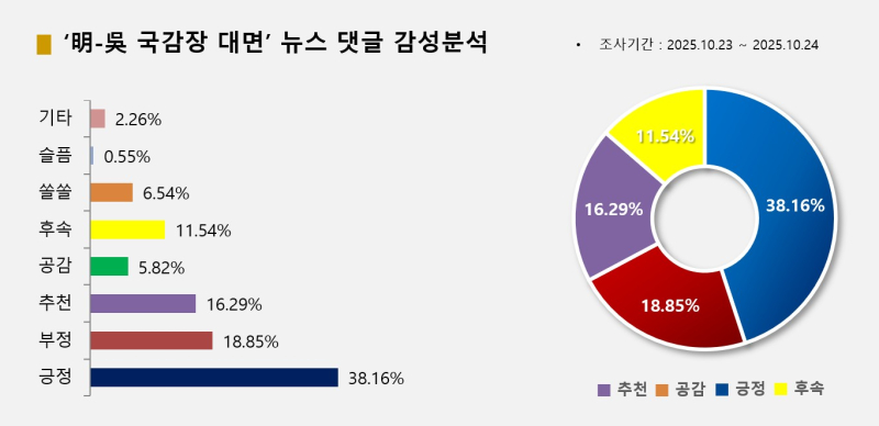 빅터뉴스가 10월 23일부터 24일 낮 12시까지 '명태균'과 '오세훈', '국정감사' 키워드로 관련기사를 집계한 결과 포털 네이버와 다음을 기준으로 관련 기사는 모두 639개, 댓글 891개, 반응 2만3222개로 집계됐다. 온라인 감성별로 다음의 '좋아요(8861개, 38.16%)', '화나요(4378개, 18.35%)', '추천해요(3783개, 16.29%)', 네이버의 '후속강추(2679개, 11.54%)' 등의 순이었다.