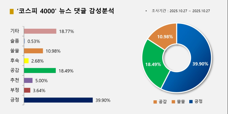 빅터뉴스가 10월 27일 오후 1시까지 '코스피'와 '4000' 키워드로 관련기사를 집계한 결과 포털 네이버와 다음을 기준으로 관련 기사는 모두 712개, 댓글 4262개, 반응 4699개로 집계됐다. 온라인 감성별로 다음의 '좋아요(1875개, 39.90%)', 네이버의 '공감백배(869개, 18.49%)' 등의 순이었다.