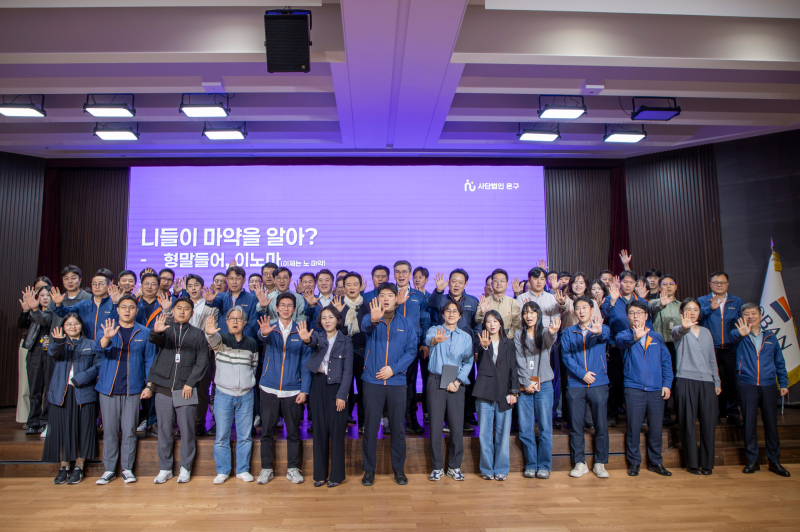 이날 행사에서는 남경필 사단법인 은구 대표를 초청해 마약예방 강연 ‘니들이 마약을 알아? – 형말 들어, 이노마(이젠, 노 마약!)’을 진행했다. 남 대표는 강연을 통해 ADHD 치료제나 다이어트약, 수면제 등 일상에서 쉽게 접할 수 있는 의약품의 오·남용과 최근 젊은 세대 사이에서 마약중독이 확산되고 있는 문제를 짚으며 개인의 인식 변화와 사회적 경각심의 필요성을 강조했다. 이날 참석한 임직원들은 질의응답을 통해 적극적으로 의견을 나누고, 마약예방 실천 의지를 다지는 세리머니에도 함께했다.