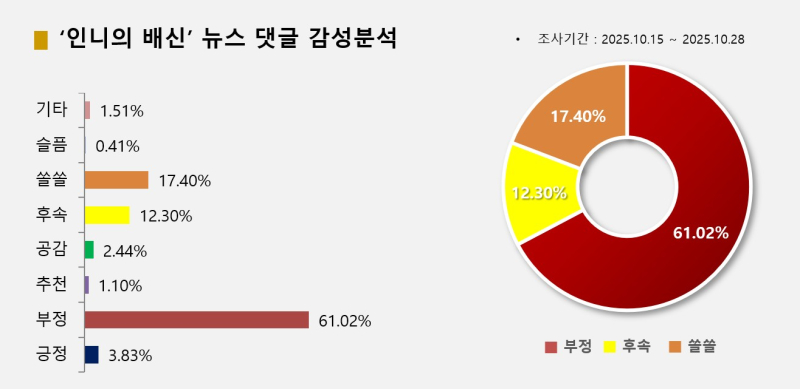 ※ 마이닝 솔루션 : BBD랩 ※ 조사 기간 : 2025년 10월 15~28일 오전 10시까지 ※ 수집 데이터 : 2547개(네이버, 다음, 네이트 기사와 댓글, 반응) ※ 분석 : 빅터뉴스